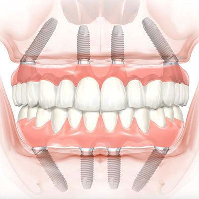 Преимущества: Кратчайшие сроки проведения самой имплантации и быстрые сроки реабилитации пациента. Меньшая стоимость относительно других видов имплантации, т.к. в аll-on-4 ставится протез на 1 челюсть.