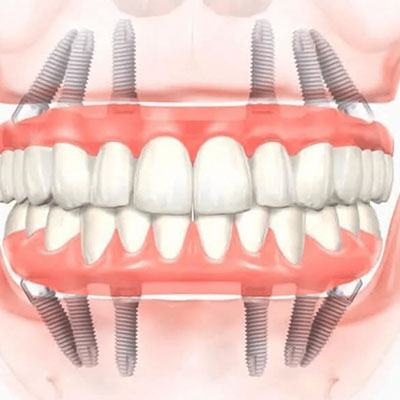 Преимущества: Кратчайшие сроки проведения самой имплантации и быстрые сроки реабилитации пациента. Меньшая стоимость относительно других видов имплантации, т.к. в аll-on-6 ставится протез на 1 челюсть.